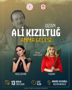 Sivas Valiliği ve İl Kültür ve Turizm Müdürlüğü’nün katkılarıyla organize edilen Ali Kızıltuğ Anma Gecesi, 12 Aralık 2024 tarihinde Muhsin Yazıcıoğlu Kültür Merkezi’nde gerçekleştirilecek. Saat 19.00’da başlayacak etkinlikte, sevilen sanatçılar Neşe Demir ve Yudum sahne alarak halk ozanının türkülerini seslendirecek.