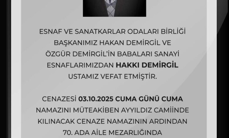 Merhumun cenazesi, 3 Ekim 2025 Cuma günü, Cuma namazını müteakip Ayyıldız Camii’nde kılınacak cenaze namazının ardından 70. Ada Aile Mezarlığı’nda defnedilecektir.
