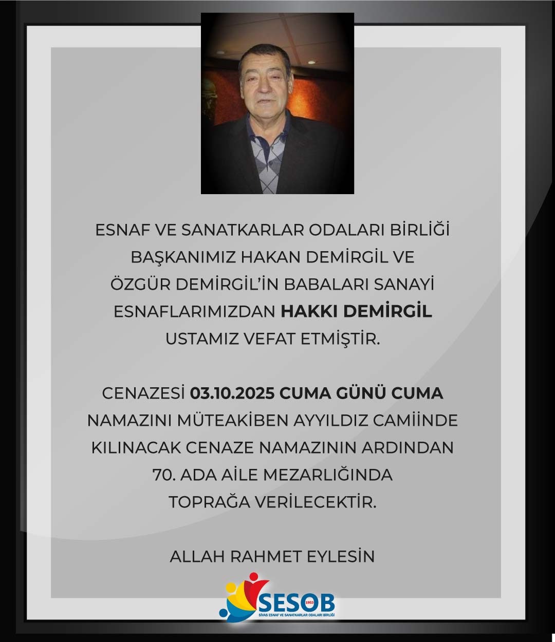Sivas Esnaf ve Sanatkârlar Odaları Birliği Başkanı Hakan Demirgil ile Özgür Demirgil’in babaları, sanayi esnaflarından Hakkı Demirgil hayatını kaybetti