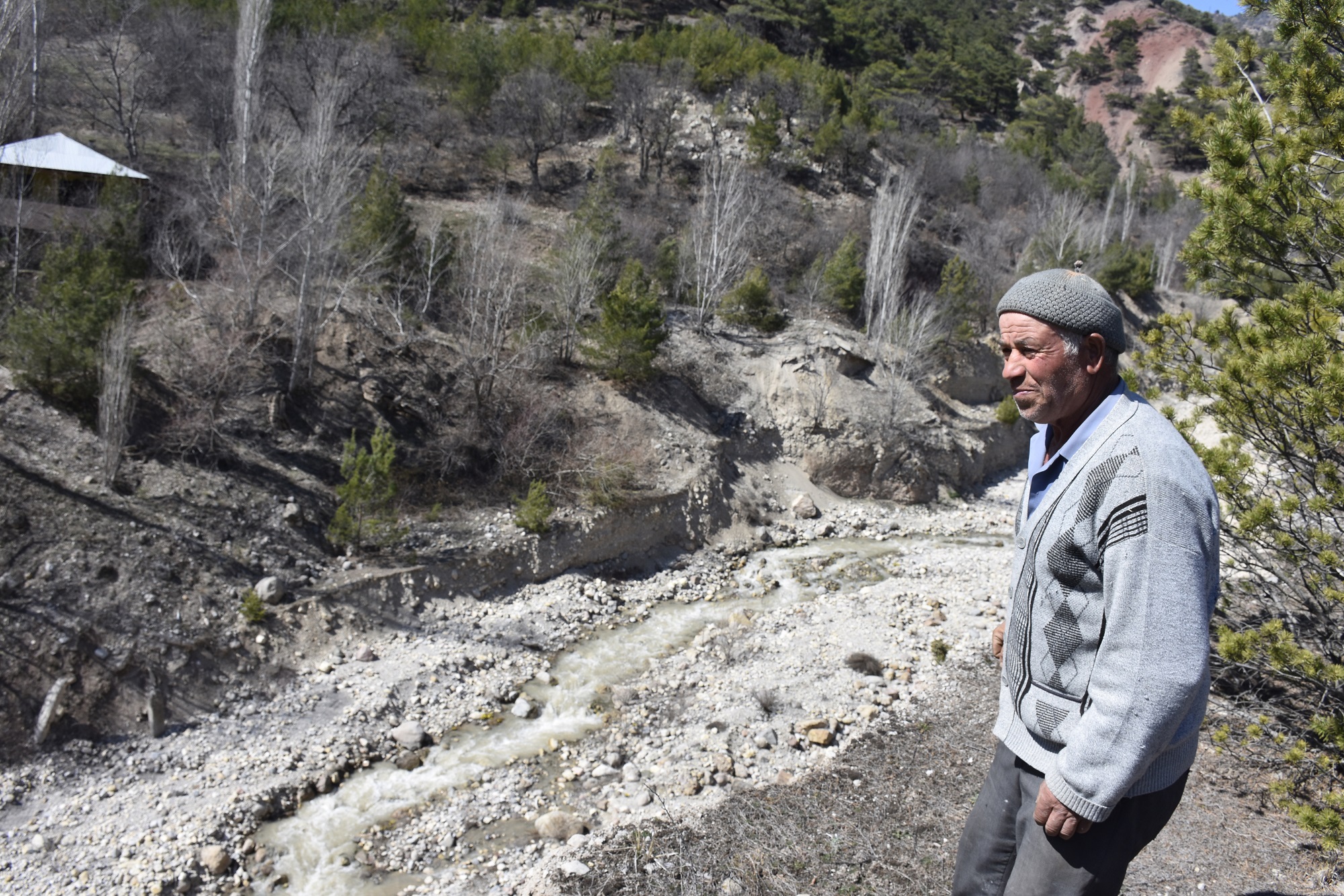 “Evimin önündeyken büyük bir gürültü duydum. Uçak sesi gibi bir uğultu geldi. Yukarıya baktığımda devasa bir toprak kütlesinin hızla aşağı indiğini gördüm. Eşim içerideydi, hemen ona seslenip dışarı çıkardım. Cami, okul, evler hiçbir şey görünmüyordu. Kaçarak köye haber verdim.”