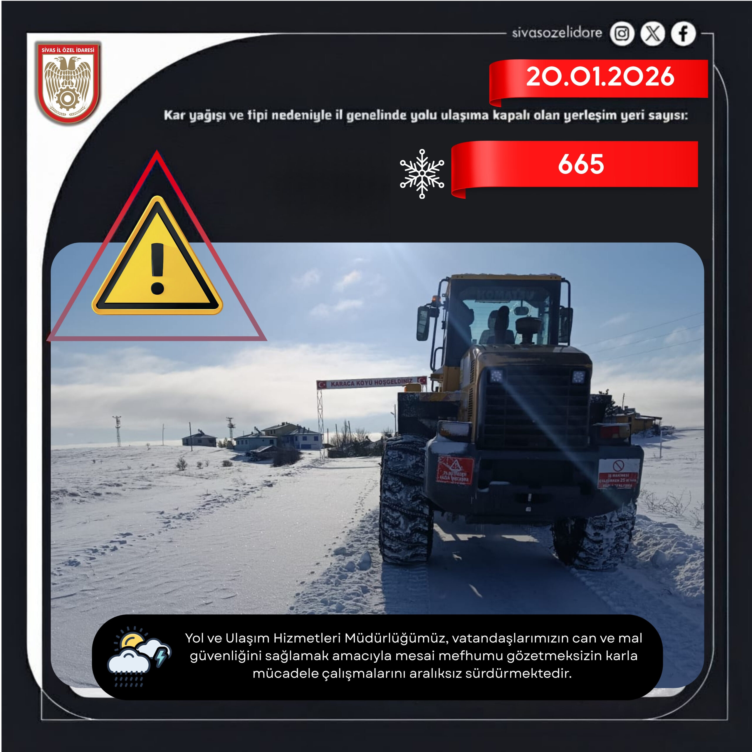 Sivas’ta etkili olan yoğun kar yağışı ve tipi, hayatı olumsuz etkilemeye devam ediyor. Sivas İl Özel İdaresi, kent genelinde 665 yerleşim yerinin ulaşıma kapandığını açıkladı.
