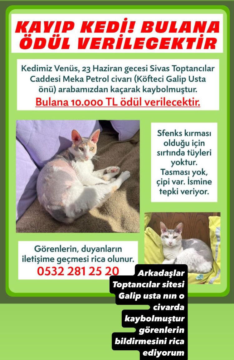 Trabzon’dan Antalya’ya tatile giderken Sivas’ta mola veren Naci Yavuz (68) ve eşi Gülüzar Yavuz’un (62) 11 yaşındaki sfenks kırması kedileri ‘Venüs’, mola sırasında minibüsten kaçarak kayboldu. Yaklaşık 10 yıldır aileyle birlikte yaşayan Venüs’ü bulmak için kentteki bir pansiyona yerleşen çift, kayıp kedilerini aramaya devam ediyor. Yavuz çifti, kedilerini bulana 10 bin TL ödül verileceğini duyurdu.