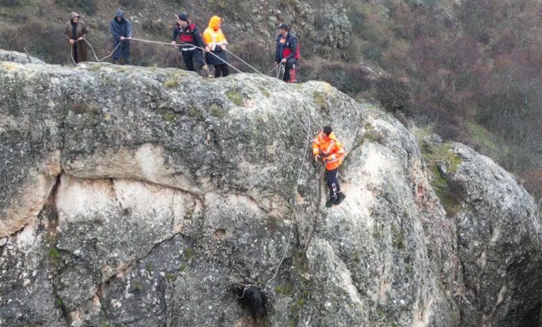 Sivas’ın Şarkışla ilçesinde kayalıklarda mahsur kalan keçi, itfaiye ekiplerinin halatlı çalışmasıyla kurtarıldı