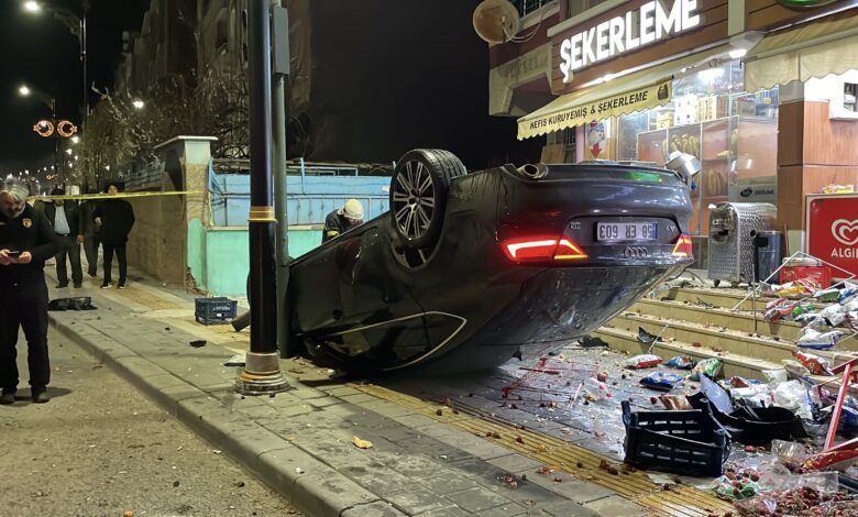 Sivas’ta Yenimahalle Hayri Sığırcı Caddesi’nde kontrolden çıkan otomobil, market ve kuruyemiş dükkânına çarparak devrildi