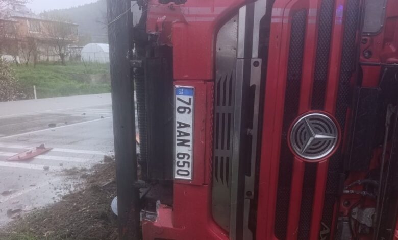 Edinilen bilgilere göre, G.B. yönetimindeki 76 AAN 650 plakalı TIR, saat 09.30 sıralarında yağışın etkisiyle direksiyon hâkimiyetinin kaybedilmesi sonucu yoldan çıkarak devrildi.