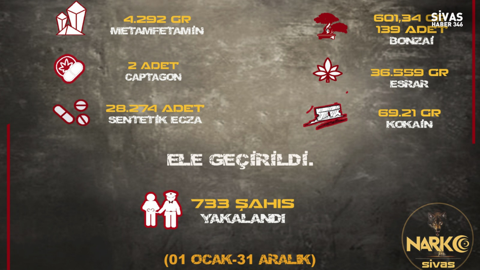 Sivas Emniyet Müdürlüğü, Narkotik Suçlarla Mücadele Şube Müdürlüğü ve Asayiş Şube Müdürlüğü ekiplerince 01 Ocak – 30 Aralık tarihleri arasında yapılan çalışmalar neticesinde, uyuşturucu ve silah kaçakçılarına yönelik operasyonlar düzenlendi.