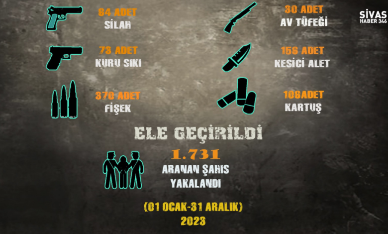 Asayiş Şube Müdürlüğü ekiplerince yapılan çalışmalarda ise 84 adet silah, 30 adet av tüfeği, 73 adet kuru sıkı, 370 adet fişek, 156 adet kesici alet ve 106 adet kartuş ele geçirildi. Yapılan kontroller ve operasyonlar sonucunda ise toplam 1.731 aranan şahıs yakalandı.