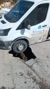 Sivas Eğriköprü Mahallesi’nde, yolda çökme meydana geldi. Bu sırada belediyeye ait kamyonetin çöken yolun içine düşmesini demir tuttu.