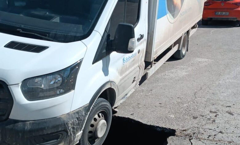 Kamyonetin tamamen çukura düşmesini demir bariyerler önledi.