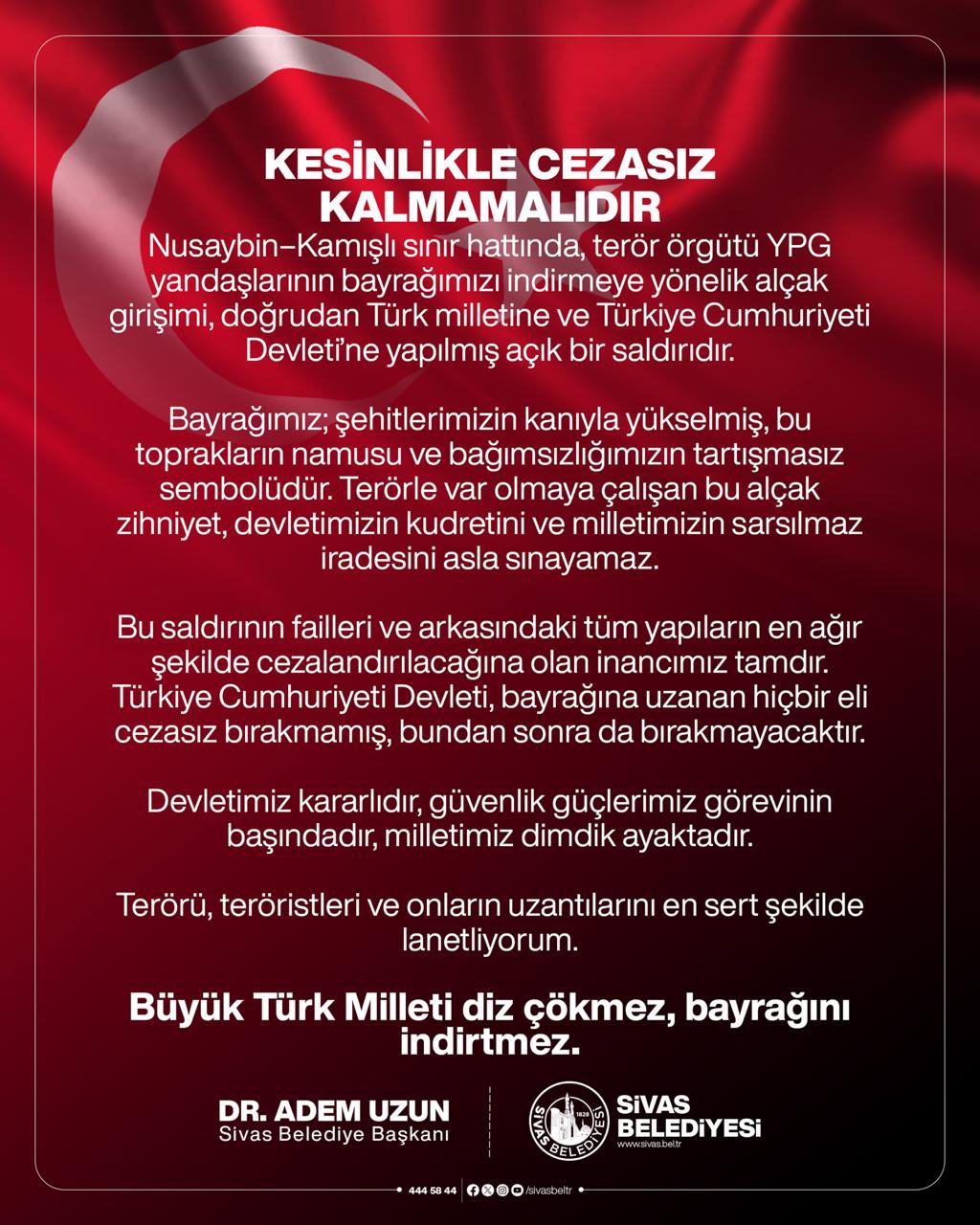 Sivas Belediye Başkanı Dr. Adem Uzun, Nusaybin–Kamışlı sınır hattında terör örgütü YPG yandaşlarının Türk bayrağını indirmeye yönelik girişimini, Türkiye Cumhuriyeti Devleti’ne ve Türk milletine yapılmış açık bir saldırı olarak değerlendirdi.